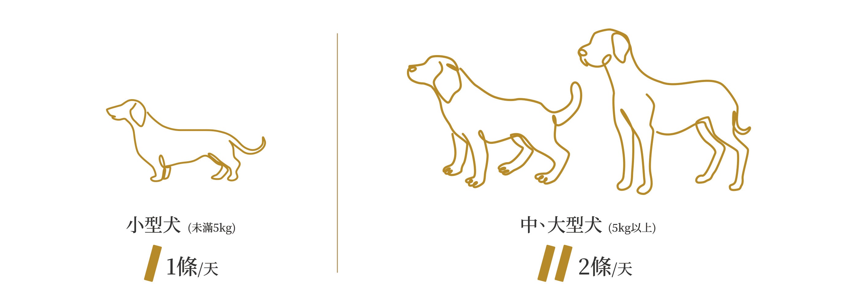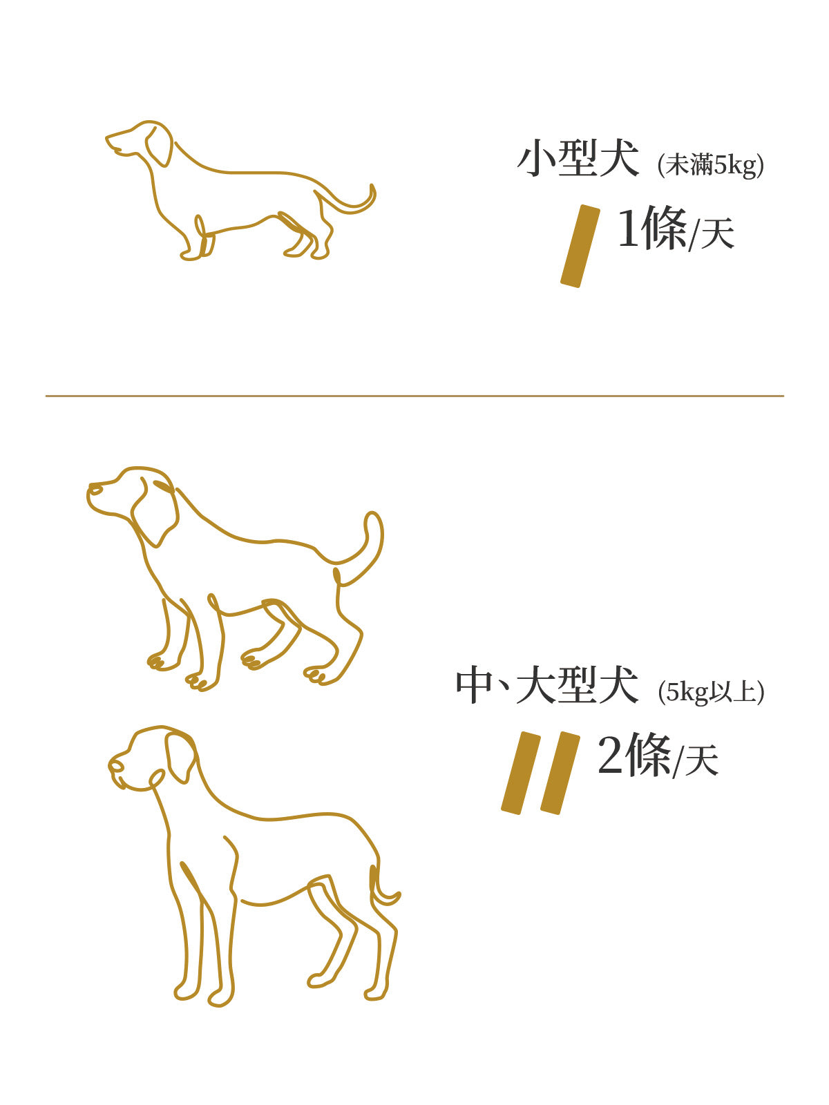建議用量:小型犬每天至少一條、中大型犬每天至少二條。在控管好熱量下,多吃無害。