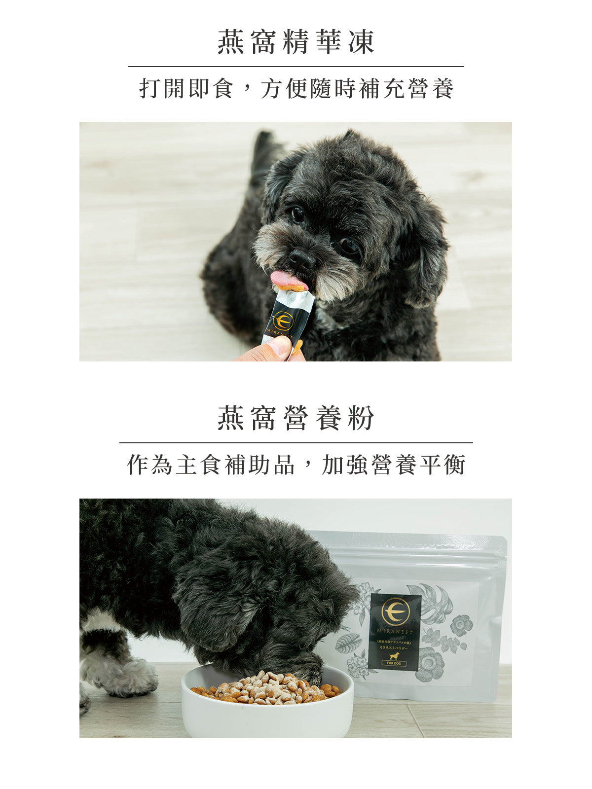 燕窩中含有豐富且稀有的唾液酸,對細胞修復和再生至關重要。包括增強免疫功能、改善皮膚和毛髮健康、促進毛孩的整體健康。燕窩同時也相當溫和,不會造成毛孩身體負擔。