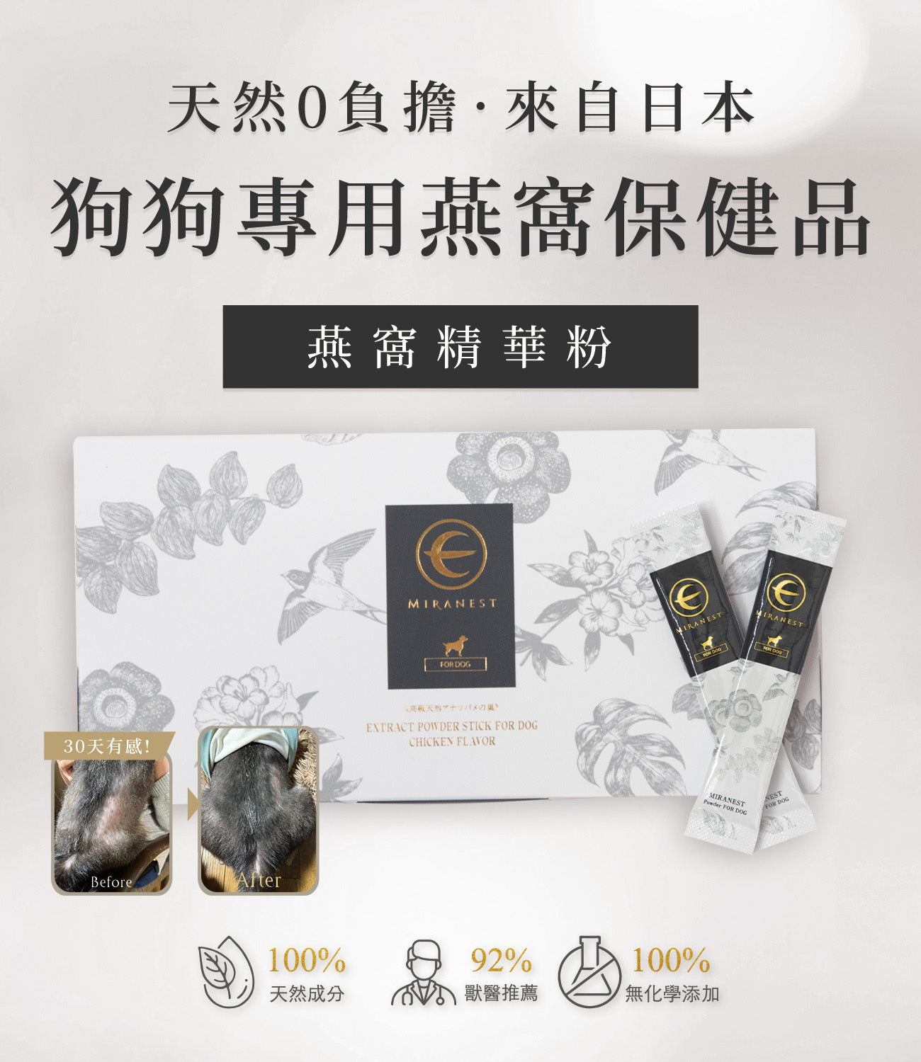 MIRANEST所使用的原料均為天然食材,等同食補概念,不含任何化學藥物,不會對毛孩有任何副作用。